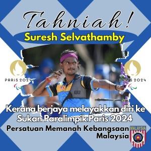Pemanah Paralimpik Malaysia, Suresh Selvathamby berjaya melayakkan diri ke Sukan Paralimpik Paris 2024 dan memenangi pingat emas di Bangkok 2023 Asian Para Archery Championships & CQT 2024 menewaskan Tseng Lung-Hui dari Chinese Taipei di perlawanan akhir.